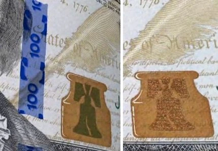 در مورد اسکناس 100 دلاری آبی نیز این امر صادق است. به علامت " جای جوهر یا دوات" روی اسکناس دقت کنید: